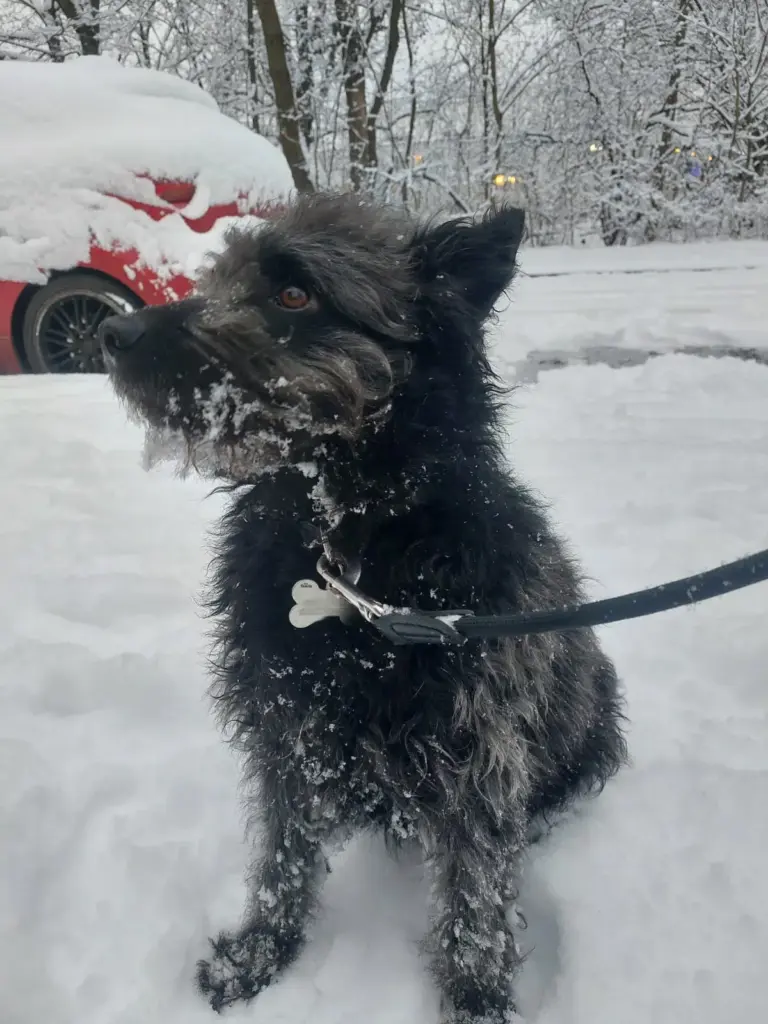 • Schwarz, graues Fell, mit einer weißen Locke auf der Brust